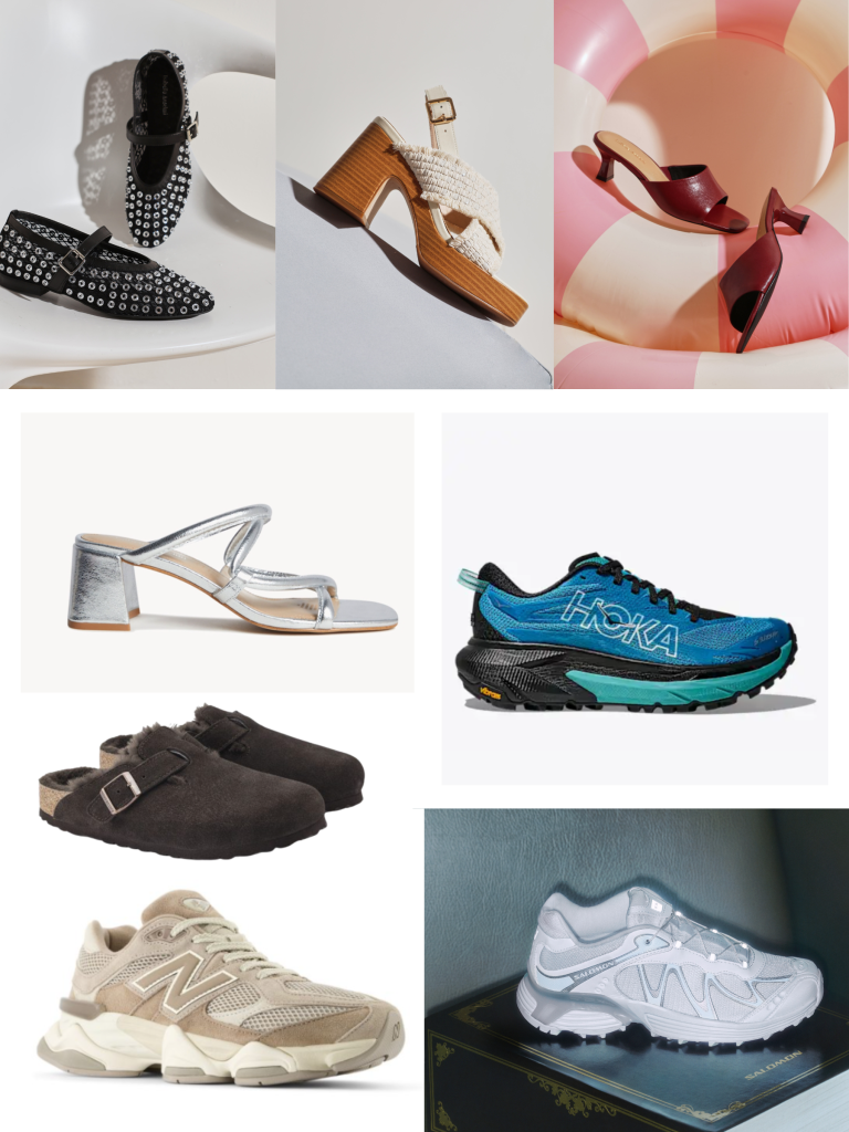 Pictured clockwise from left: Merchant 1948: Benita Flat $239.90, Stephanie Woven Sandal, Anselmi Dottie Sandal $249.90, Frontrunner: Hoka Mafate 5, Fridge Freezer: Salomon XT-Whisper, Issimo Shoes: New Balance 9060 $250, Birkenstock Boston Suede $420, Merchant 1948 Isabella Anselmi Danali Sandal $249.90