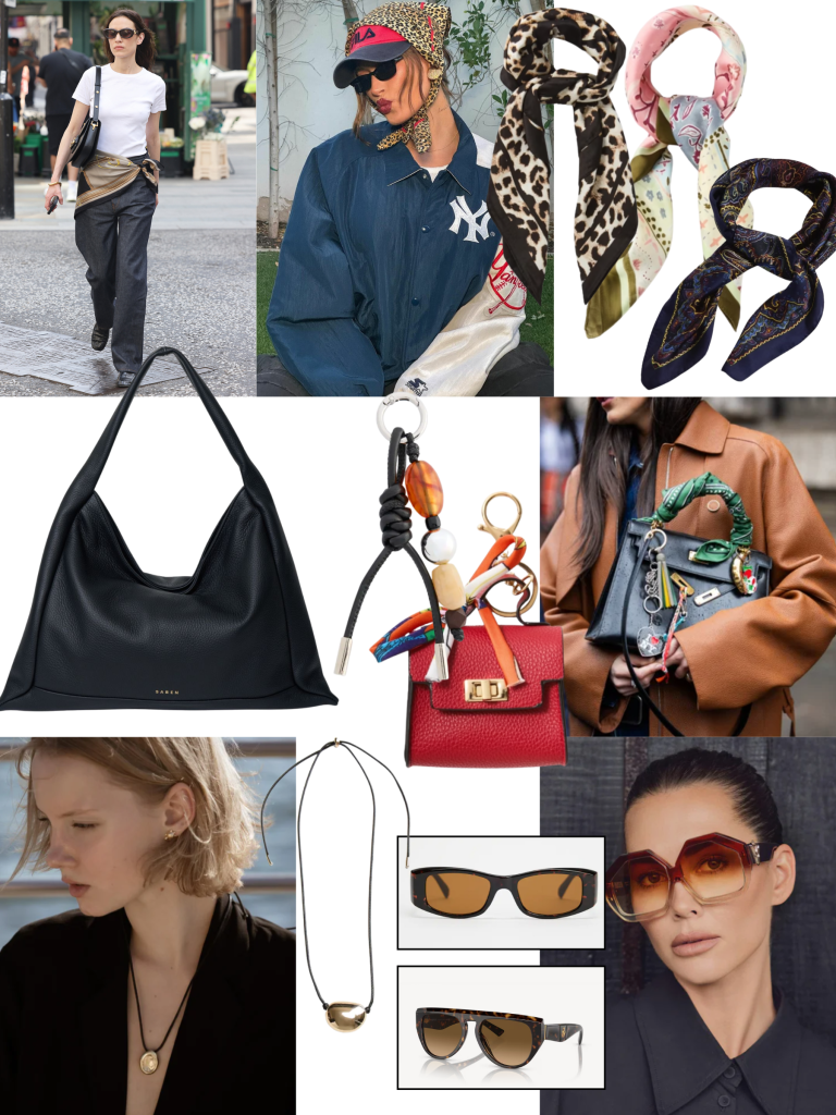Pictured clockwise from left: Models Alexa Chung, Hailey Bieber, Kmart: Scarves $8 each, Issimo Shoes: Saben Haze Shoulder Bag $589, Glassons: Bead Bag Charm $9.99, Kmart: Red Bag Charm $9, Social Clothing: Valley Colosseum Sunglasses $359, Glassons: Slim Rectangle Sunglasses $24.99, OPSM: Ferrari FH2005U $1038, Glassons: Statement Pendant Cord $12.99