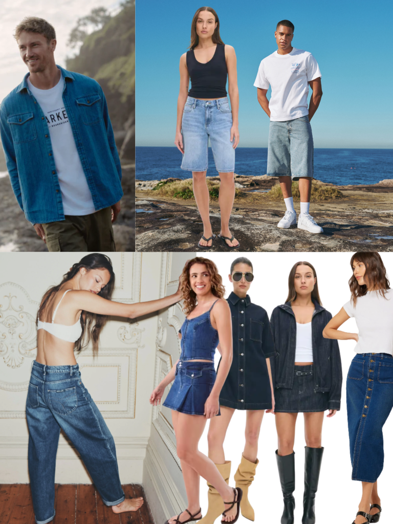 Pictured clockwise from left: Barkers: Callahan Denim Overshirt $149.99, Glassons: Low Rise Denim Short $49.99, Hallensteins: Relaxed Fit Denim Shorts $44.99, Social Clothing: Rollas The Gigi Barrel $189.99, Glassons: Denim Shirt Mini Dress $69.99, Funnel Denim Jacket $89.99 + Belted Mini Skirt $49.99, Social Clothing: Rollas Sailor Skirt $179.99