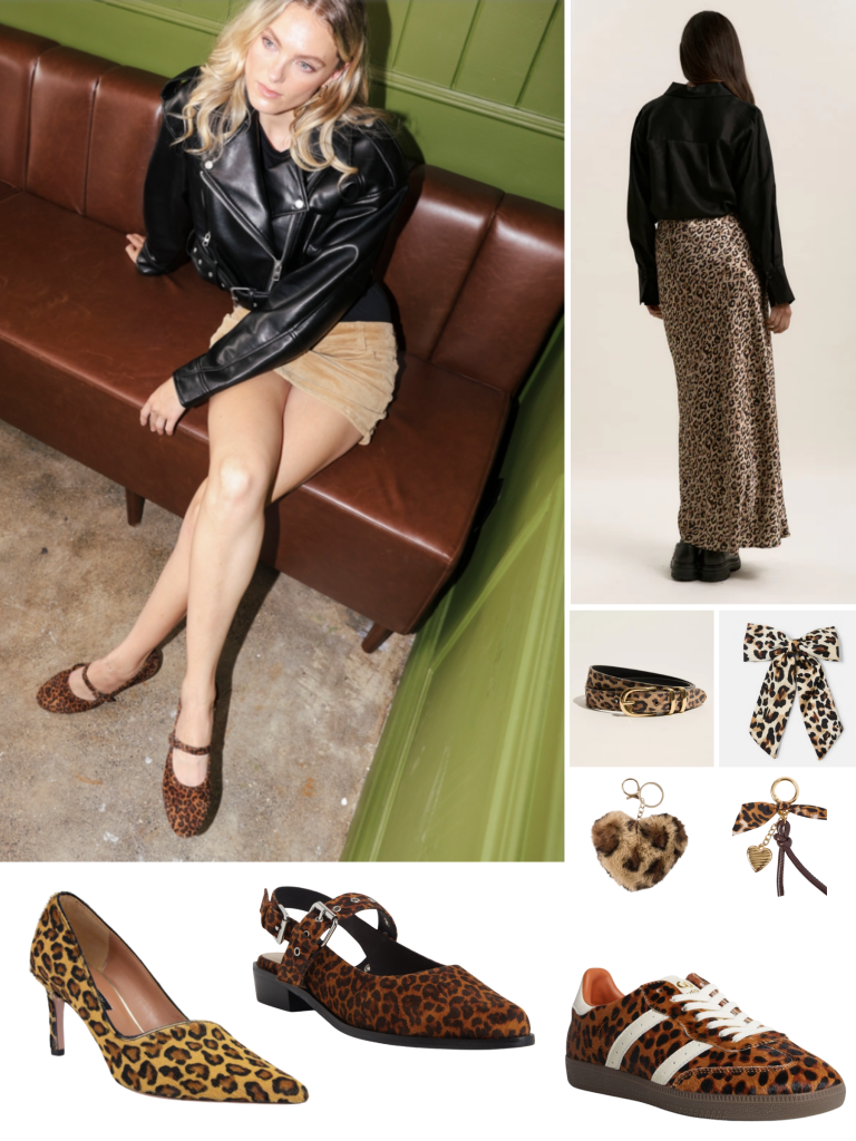 Pictured clockwise from left: Merchants: (model), Max: the Maxi Skirt Leopard Print $139.99, Mallory Leopard Print Belt $99.99, Kmart: Bow Hair Clip $3, Leopard Heart Key Ring $7, Leopard Bow Bag Charm $7, Merchant 1948: Goodsole Parallel Sneaker $189.99, Isabella Anselmi Wes t Slingback Flat $239.90, Issimo Shoes: Oxitaly Heel in Leopard $399.99