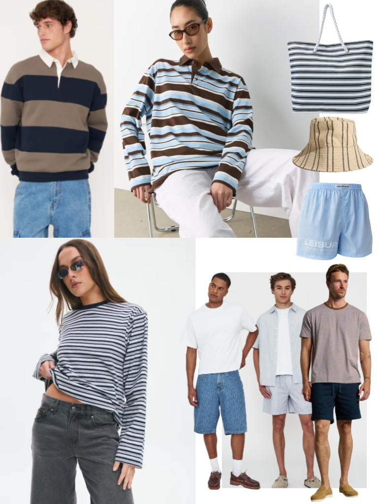 Pictured clockwise from left: Hallensteins: Heavy Weight Polo $49.99, Glassons: Oversized Polo Top $39.99, Kmart: Rope Canvas Beach Bag $14, Max: Rose Stripe Bucket Hat $59.99, Hallensteins: Leisure Striped Boxers $14.99, Rollins Supima Stripe Tee $69.99, Textured Stripe Shirt $49.99 + Shorts $39.99, Striped Baggy Jorts $49.99, Glassons: Oversized Long Sleeved Top $29.99