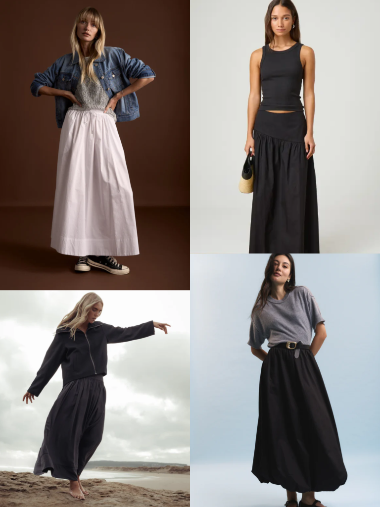 Pictured clockwise from left: Max The Everyday Poplin Skirt $149.99, Glassons: Poplin Asymmetrical Maxi Skirt $59.99, Max: Carrie Tiered Skirt $169.99, Max: Juniper Bubble Hem Skirt $169.99